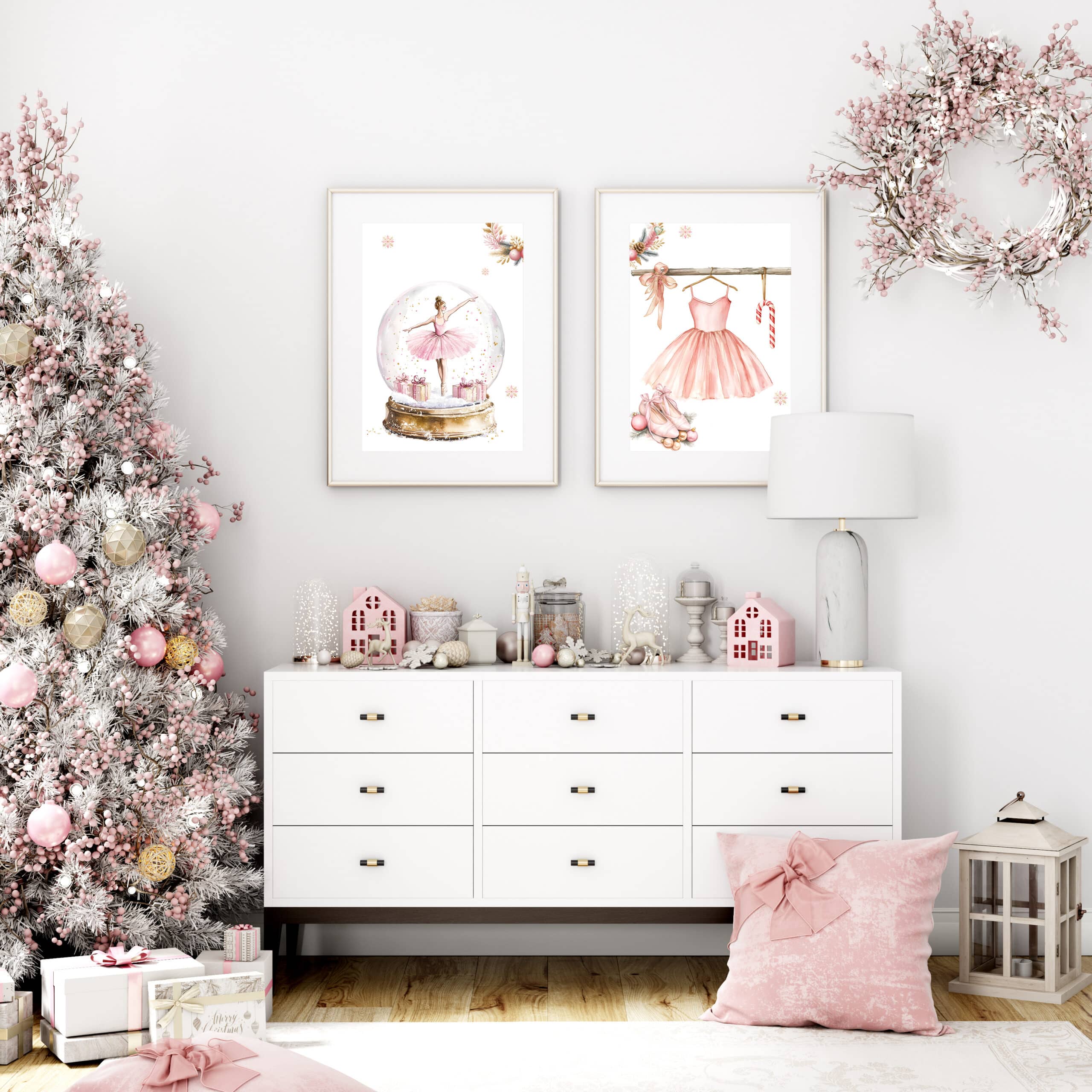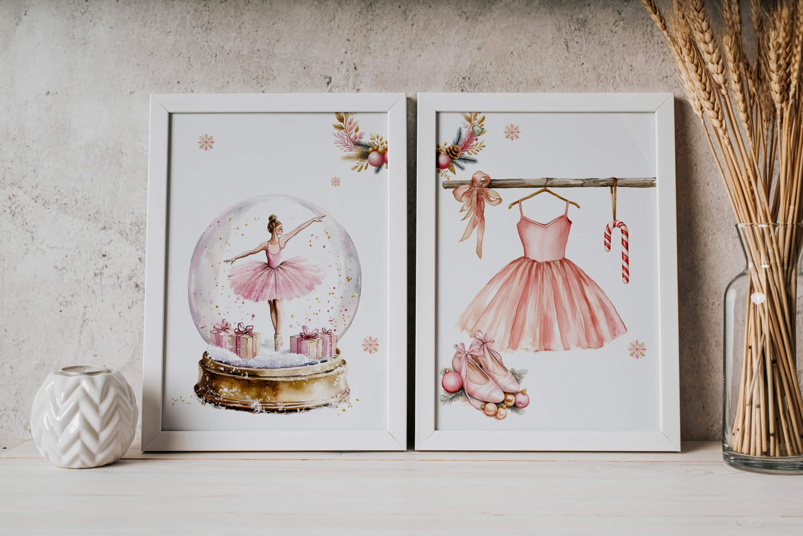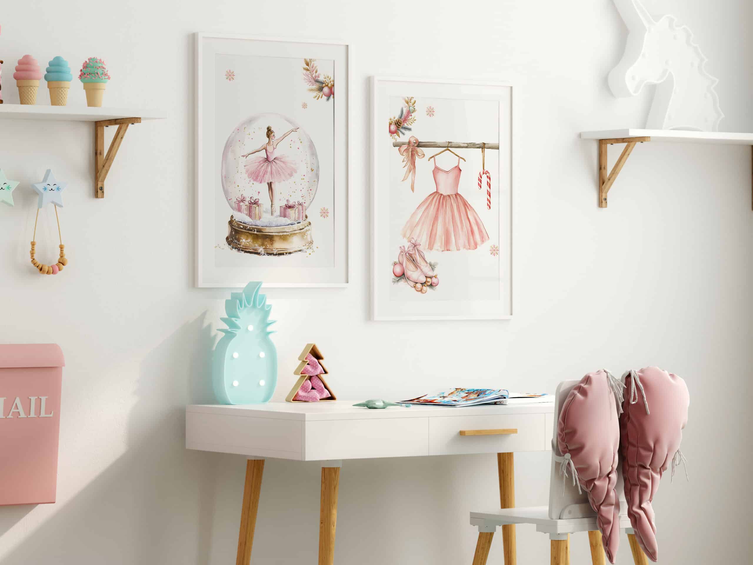 Glob de zăpadă cu balerină – Set 2 Tablouri Crăciun Adaugă magie și delicatețe camerei fetiței tale cu acest set fermecător de tablouri!