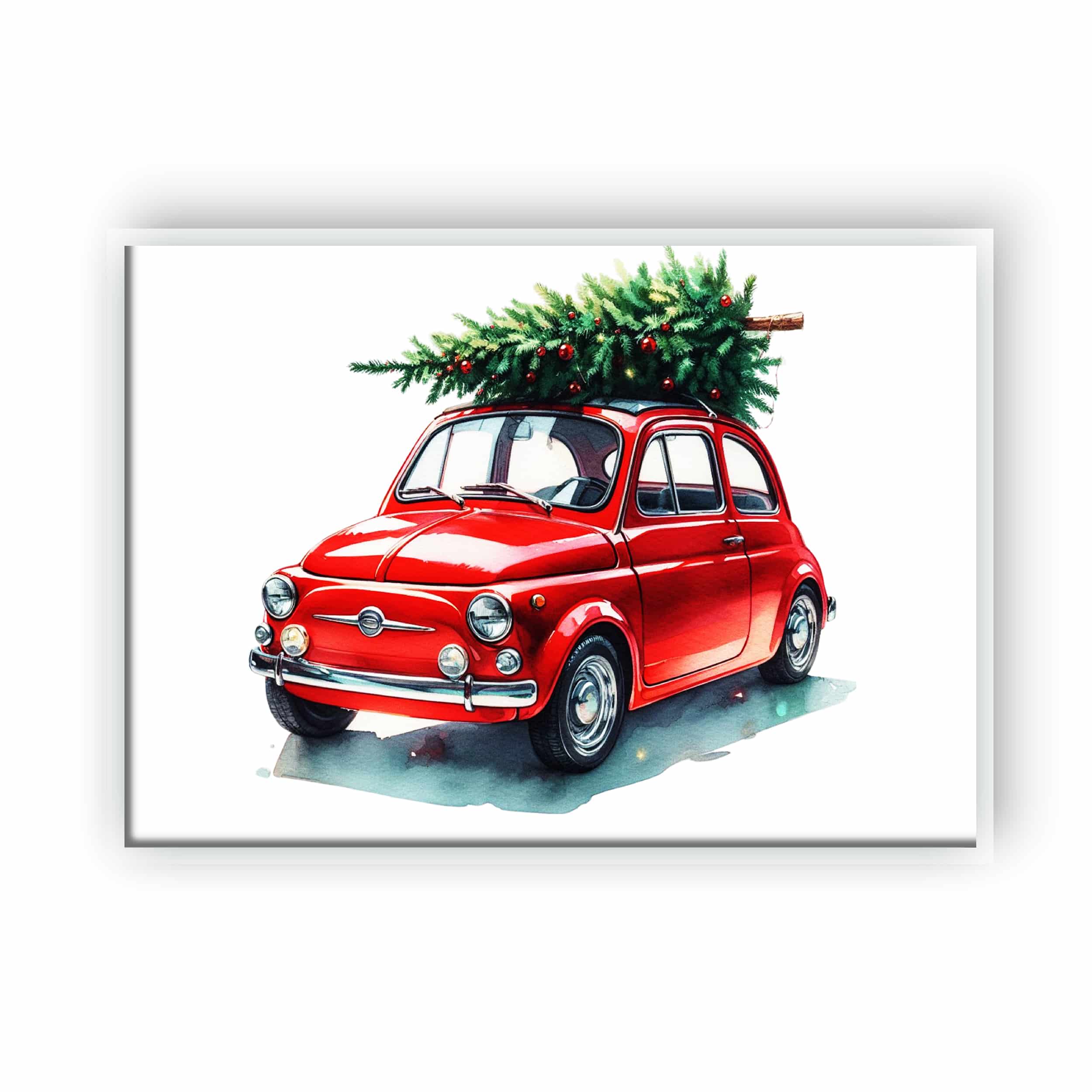 Tablou Red Christmas Car – Acest tablou vibrant, cu o mașină roșie încărcată cu un brăduț de Crăciun, surprinde esența bucuriei și entuziasmului specific sezonului.