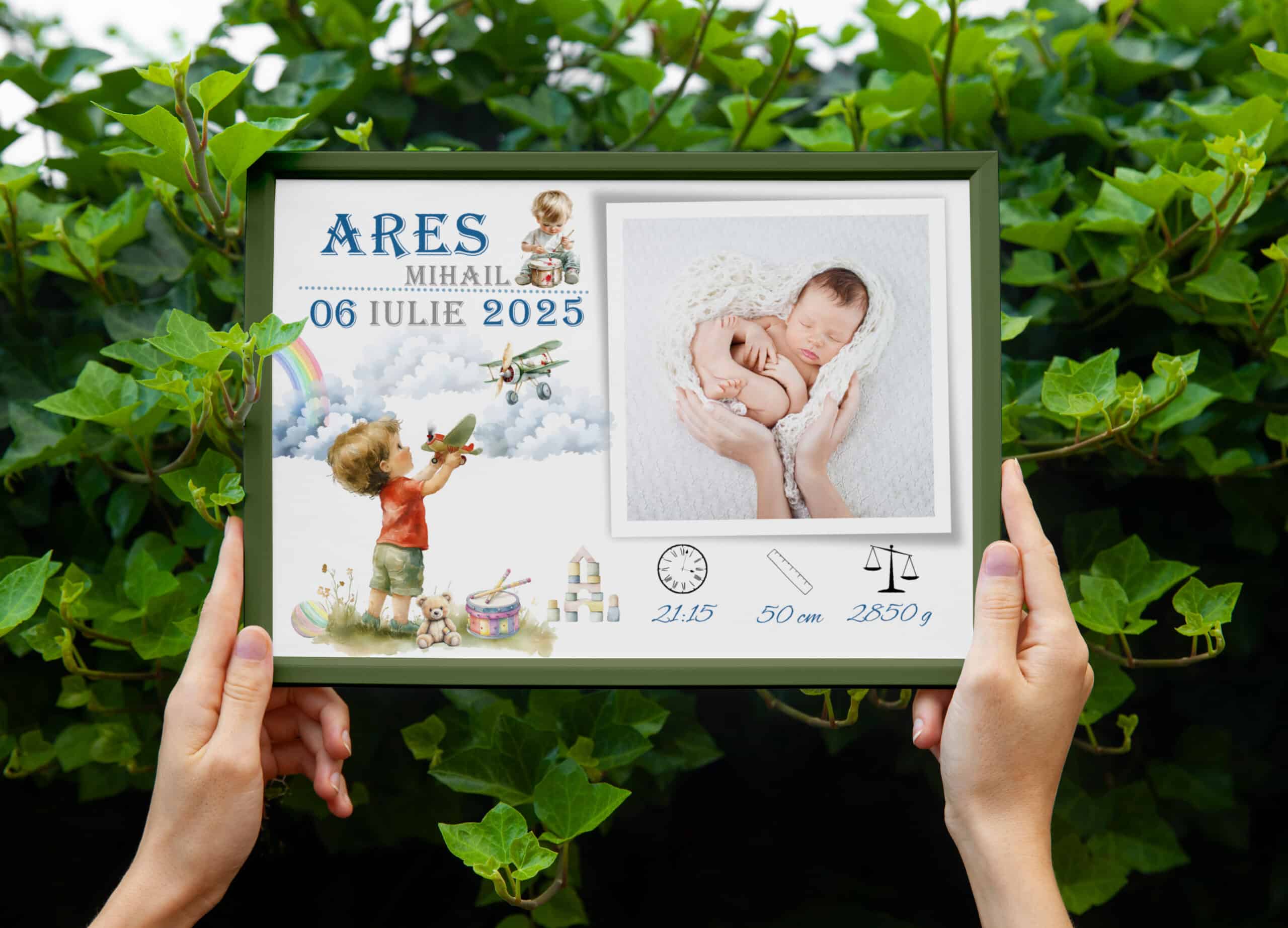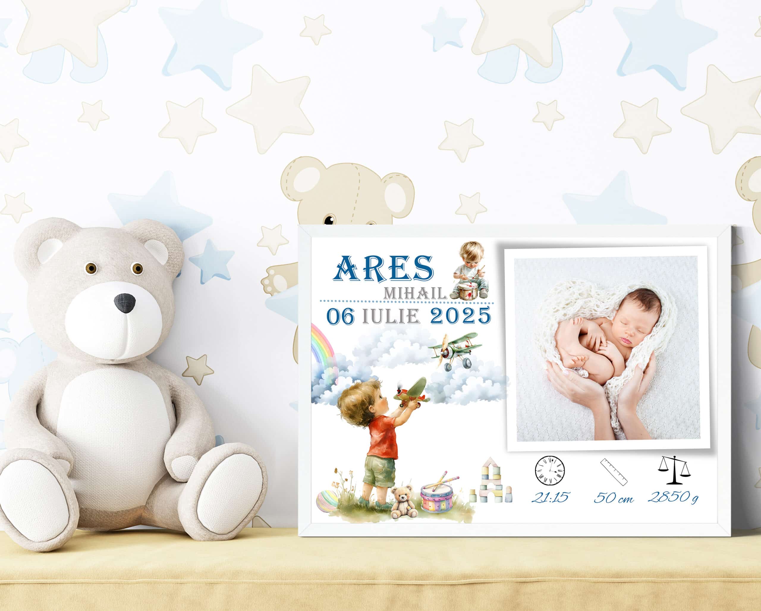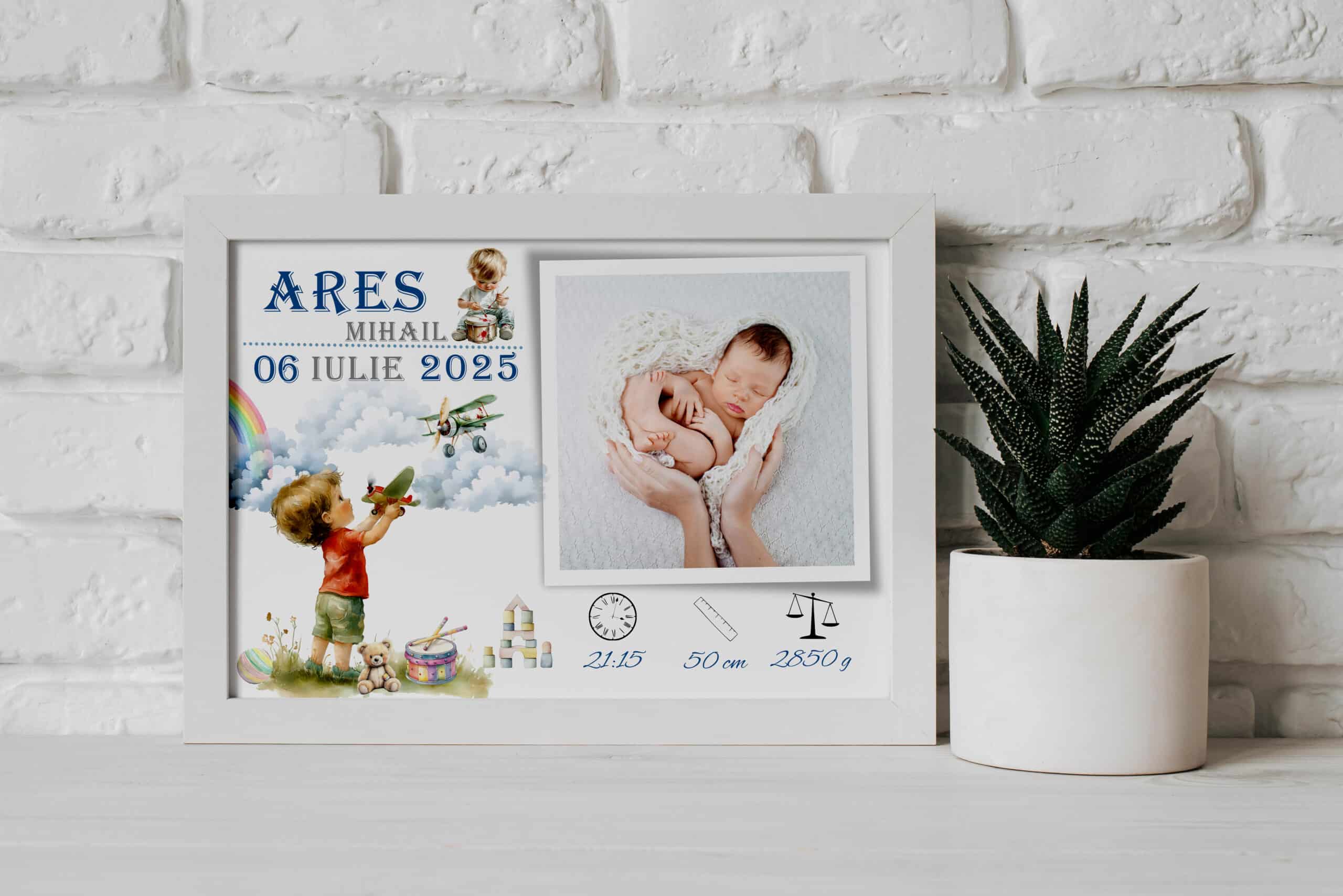 Tabloul Personalizabil cu poză nou-născut – Ares cuprinde datele personale de la naștere (nume, dată și oră, lungime, greutate) fiind potrivit pentru a fi oferit cadou de aniversare ori pentru decorarea camerei copilului tău. Tot ce trebuie să faci este să încarci fotografia dorită și să ne lași detaliile necesare pentru personalizare.