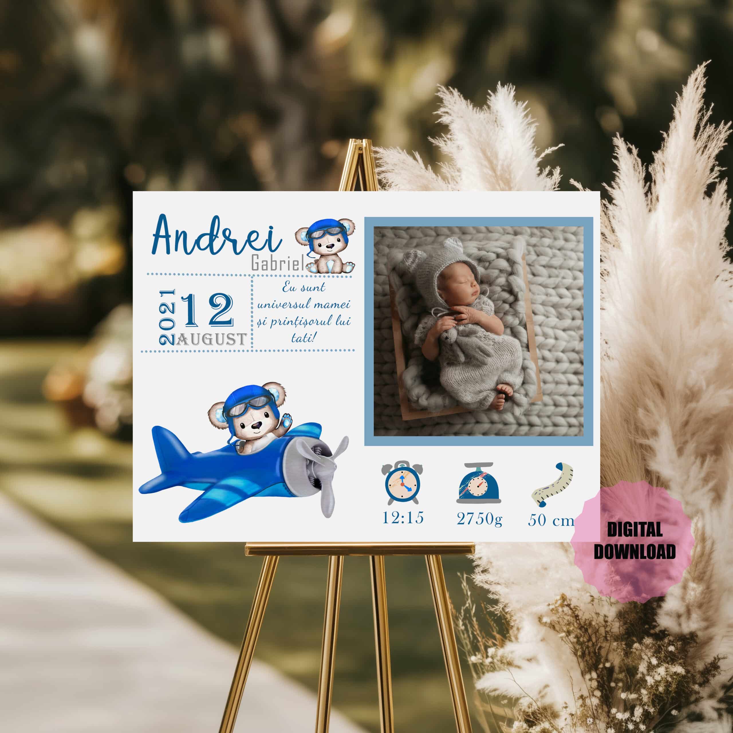 Păstrează magia primei zile cu un tablou personalizat pentru nou-născut, creat special pentru a celebra venirea pe lume a bebelușului. Fie că ești în căutarea unui cadou de botez original sau dorești un decor pentru camera bebelușului sau un panou de primire spectaculos la sala de botez , acest poster digital este alegerea perfectă.